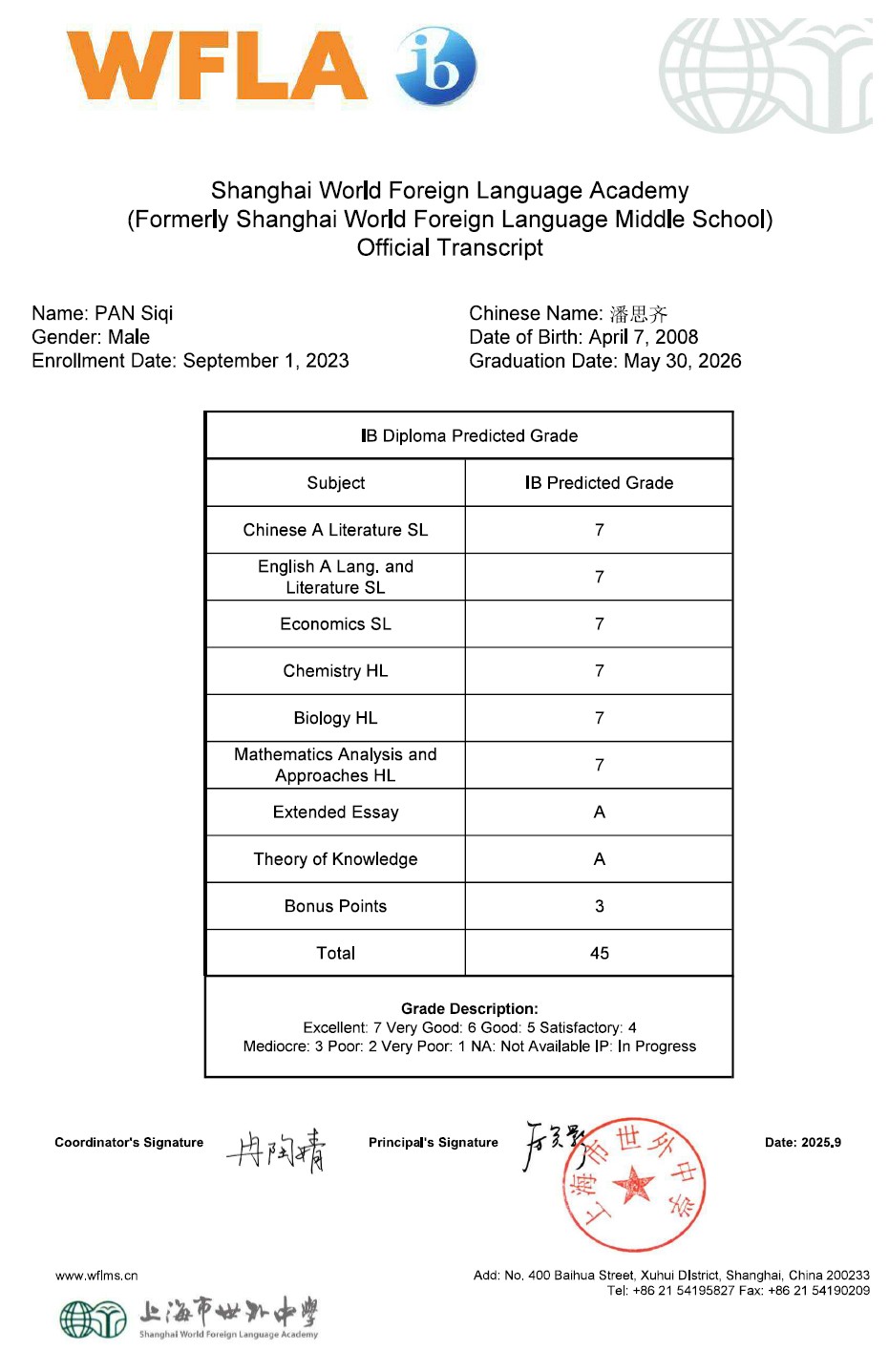 This is my official transcript at Shanghai World Foreign Language Academy, including the IB Diploma predicted grade and grades for all 3 school years.