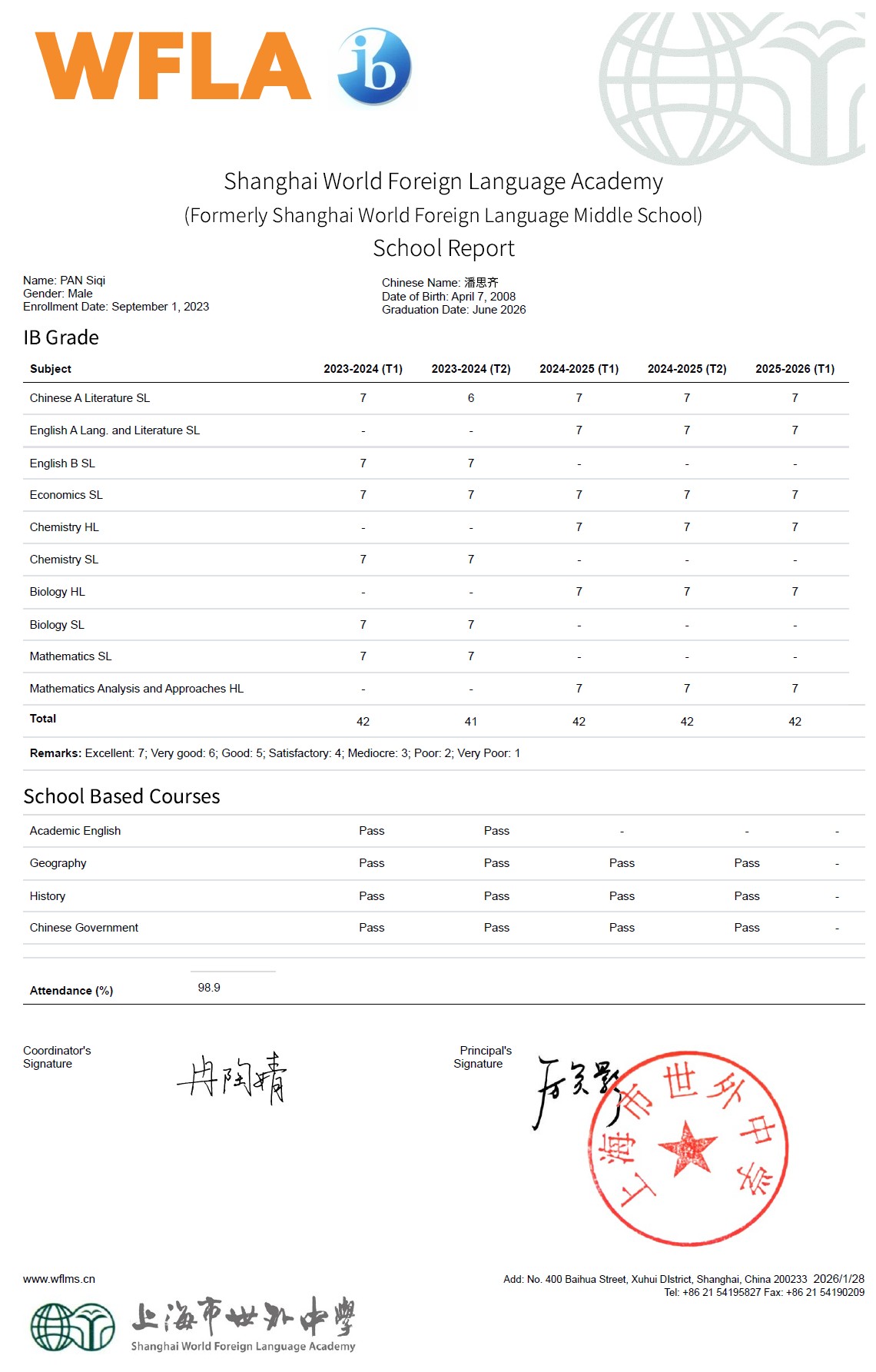 This is my official transcript at Shanghai World Foreign Language Academy, including the IB Diploma predicted grade and grades for all 3 school years.