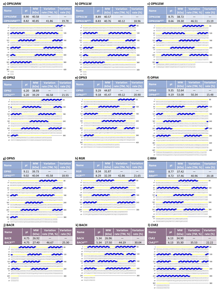 I selected a variety of retinylidene proteins (opsins), with 9 animal (human) ones and 3 microbial ones. Some of them are better studied and implicated in diseases, while others are less well studied. In either case, QTY-designed soluble versions show promise in facilitating futures studies and applications. This is a brief introduction to all these proteins: