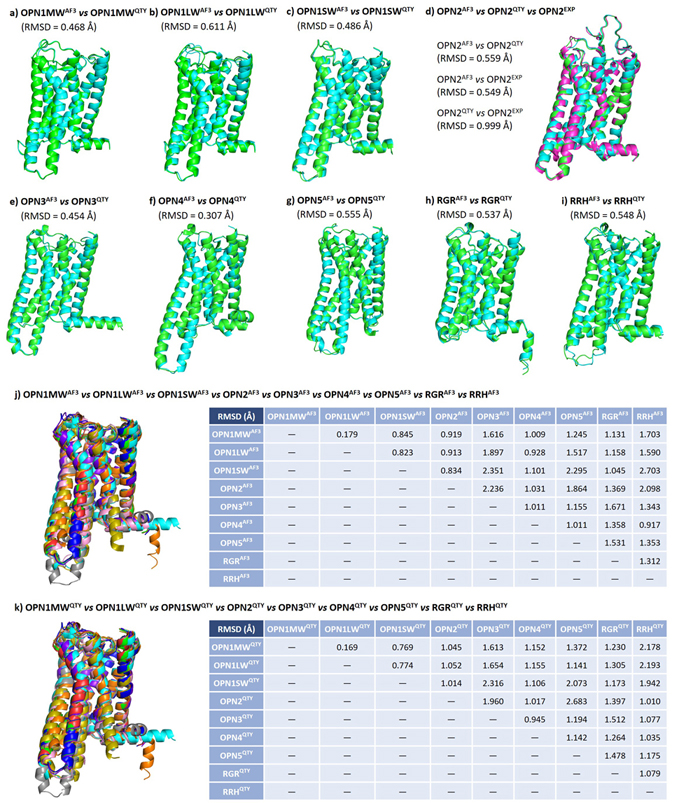 In this figure, I compare the computer-predicted QTY analog structures, computer-predicted native structures, and experimentally-determined native structures of human opsins. It turns out the these three types of structures are very similar to each other. In addition, since all 9 human opsins are evolutionarily related, I perform a pairwise comparison among native and QTY protein structures and found the patterns similar.
