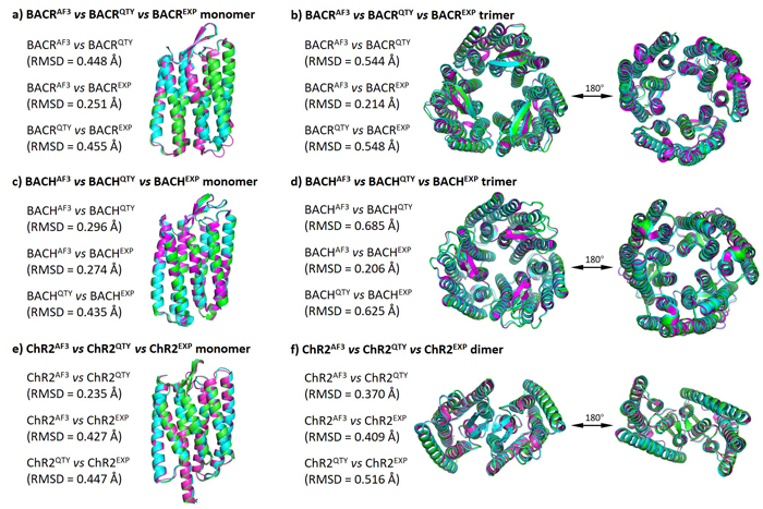 In this figure, I compare the computer-predicted QTY analog structures, computer-predicted native structures, and experimentally-determined native structures of microbial opsins. These three types of structures are very similar to each other. Additionally, since these three microbial opsins usually form oligomers (dimers and trimers), I perform a similar comparison between the computer-predicted QTY analog oligomer structures, computer-predicted native oligomer structures, and experimentally-determined native oligomer structures.