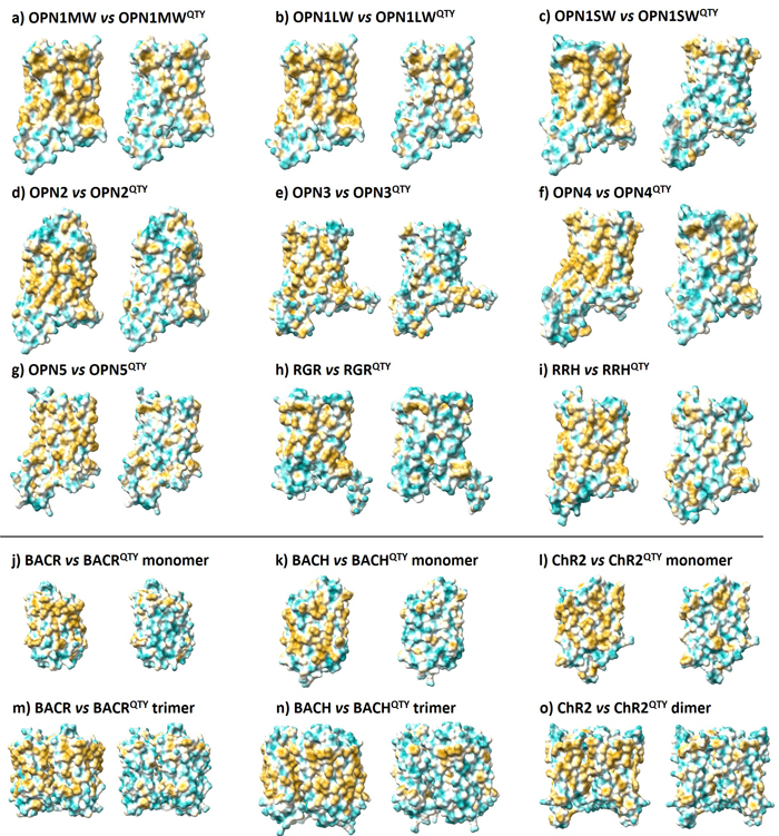 Furthermore, water-soluble QTY opsins could be useful clinically, since they could be delivered and/or expressed in the eye without forming aggregates and precipitating. It is not unreasonable to hypothesize that QTY opsins can still pass through the photocycle and interact with downstream signaling proteins. In light of this, QTY opsins may facilitate the optogenetic therapy of ophthalmological diseases, providing a potential pathway in restoring basic vision for those who have lost it.