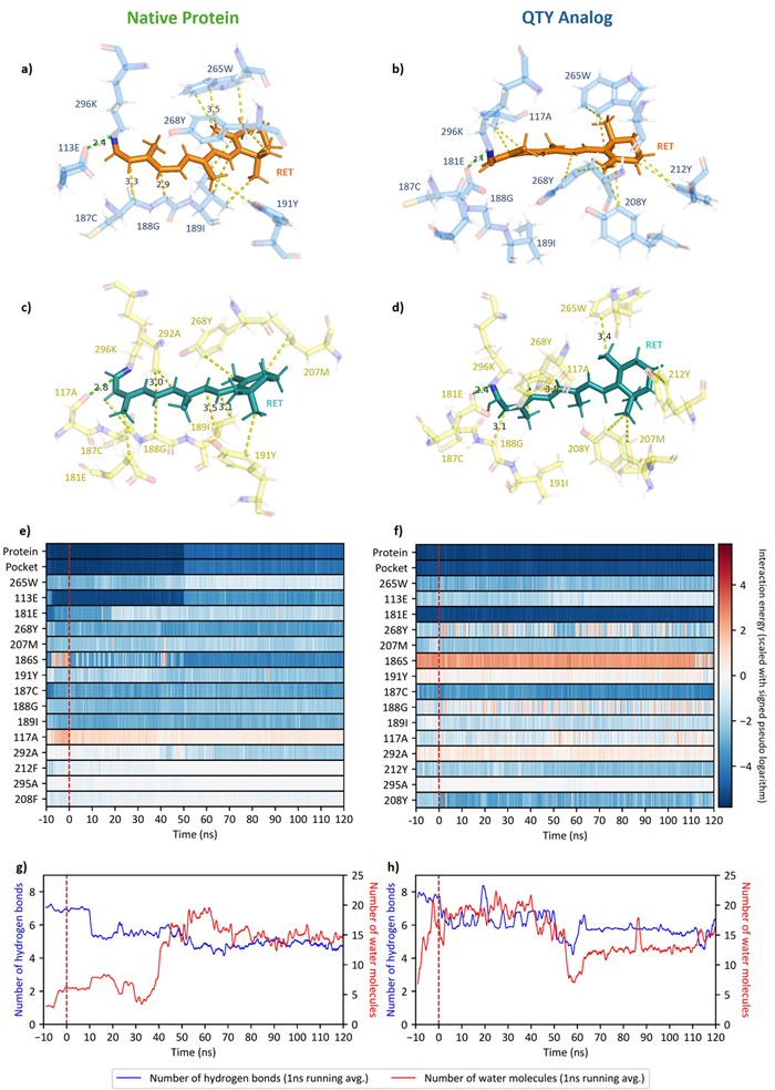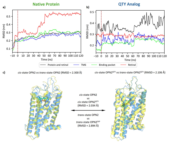 Here, I simulate the 11-cis to all-trans isomerization of the retinal molecule inside rhodopsin (OPN2). This isomerization occurs when a photon hits the protein, i.e., when the protein receives light. As we can deduce from this figure, both the native protein and the QTY analog are likely responsive to light.