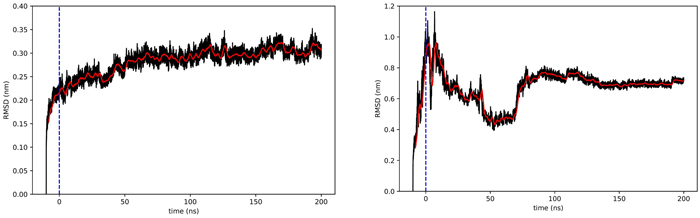 - During simulation, I observed a strange phenomenon. The figure below shows the RMSD (a metric of structural change) for native rhodopsin (left) and the QTY-designed rhodopsin (right). There was a sudden, abrupt change in the QTY version. At first, I was puzzled because it was as if the protein had been struck by an invisible force. I later realized I had omitted an auxiliary “tail” of the protein during visualization. It was exactly this tail that whipped the rest of the structure into a strange shape. Once I removed the tail, the problem was resolved.