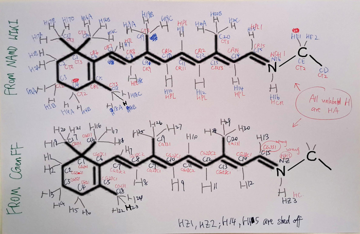 - At first, I struggled to find reliable parameters for simulating the retinal molecule. I used CGenFF to generate parameters, but the results were not ideal.
